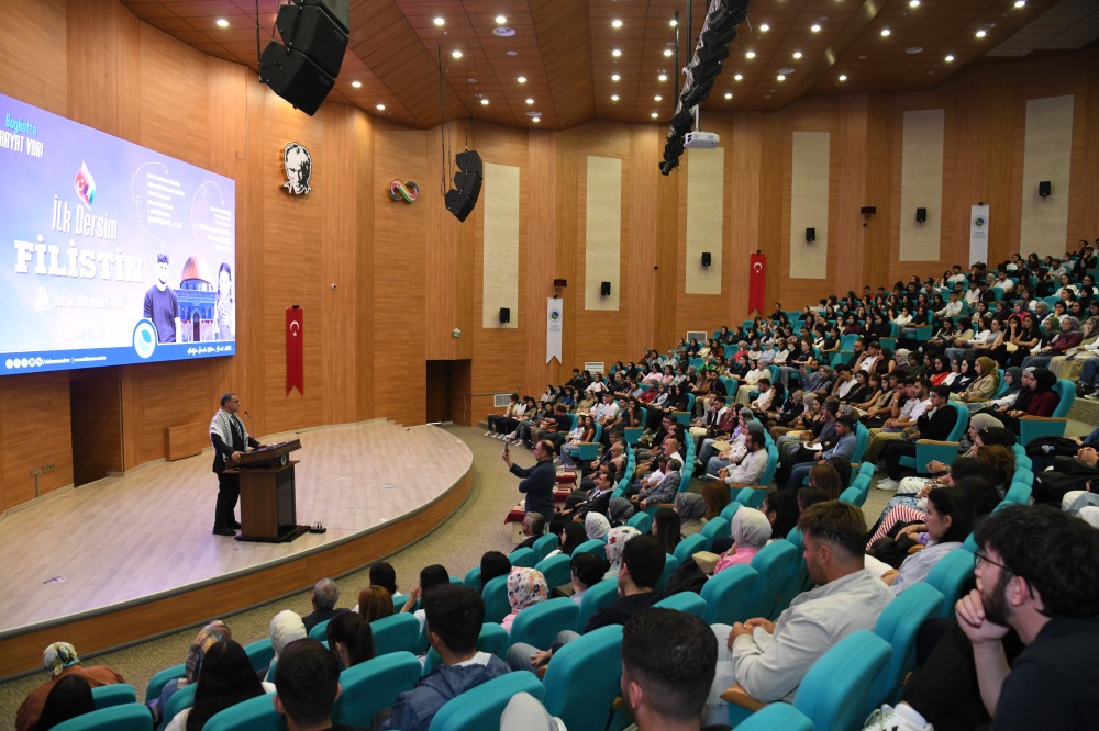 During the “My First Lesson: Palestine” event, Rector Prof. Dr. Mustafa Kasım Karahocagil delivered a welcome speech, drawing attention to the ongoing genocide and humanitarian crisis in Palestine and Gaza. He stated that with this event, they aim to raise awareness about the oppression the people of Palestine have faced over the past two years. Prof. Dr. Karahocagil emphasized that Israel is carrying out genocide against Palestinians in full view of the world and continues this oppression with the support of major world powers. He noted that they wear blue ribbons to support the Sumud Flotilla, a global activist initiative against the genocide. “By wearing blue ribbons, we demonstrate our solidarity with Palestine,” he said. He added that today’s “My First Lesson: Palestine” event is meant to create even greater awareness. Rector Karahocagil stated that Israel’s sole objective has always been to establish a Greater Israel and warned that after Gaza, Syria and eventually Turkey—and the entire Islamic world—would be at risk. He pointed out that this goal is no longer merely suggested but is now openly declared by the leaders and supporters of the Zionist Israeli state. “Therefore, I believe it is essential for us to be aware of this reality,” he concluded.