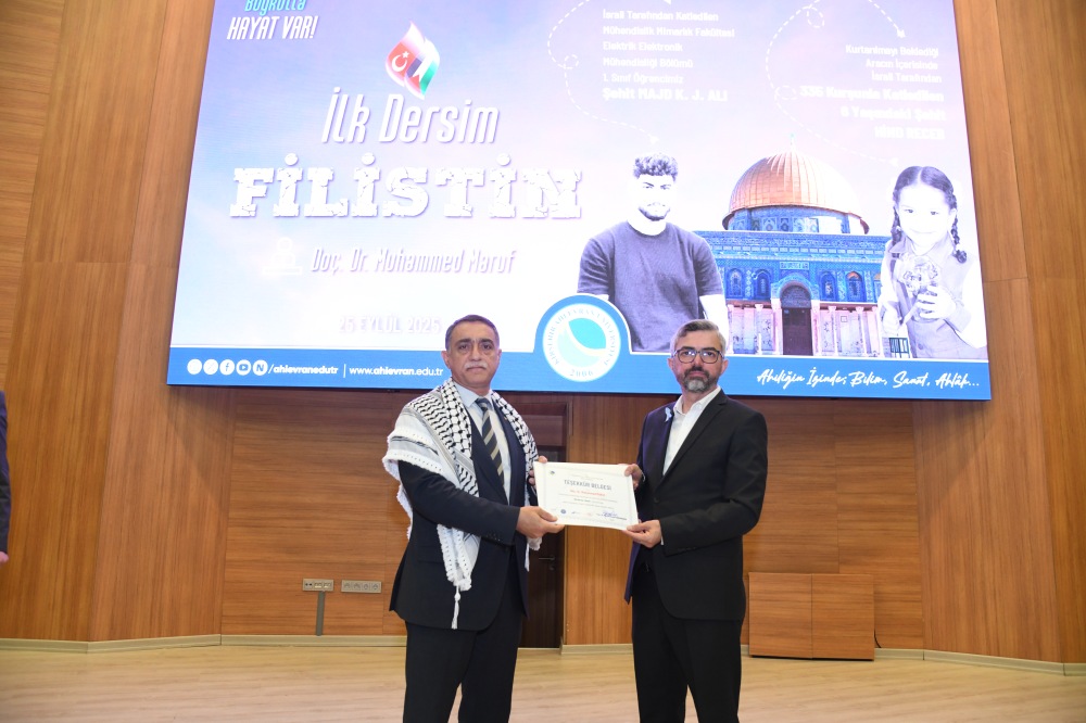 At the end of the event, Rector Prof. Dr. Mustafa Kasım Karahocagil presented a certificate of appreciation to Assoc. Prof. Dr. Muhammed Maruf for his presentation “My First Lesson: Palestine.”