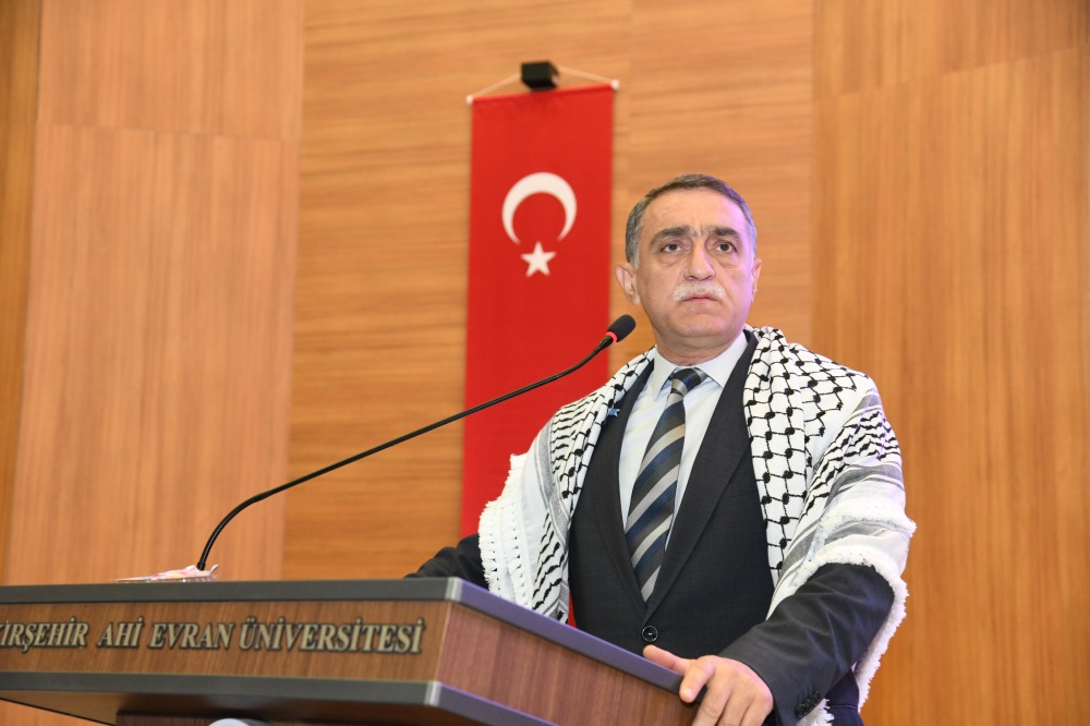 Kırşehir Ahi Evran University started the 2025–2026 academic year with a meaningful event. The Rectorate organized an event titled “My First Lesson: Palestine.” The event took place on September 25, 2025, at the 15 July National Will Hall in the Ahi Evran Congress and Culture Center. Rector Prof. Dr. Mustafa Kasım Karahocagil, Vice Rectors Prof. Dr. Musa Özata, Prof. Dr. Hüseyin Şimşek, and Prof. Dr. Ali Güneş, as well as academic and administrative staff and students attended the event.