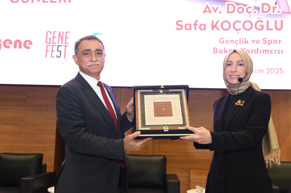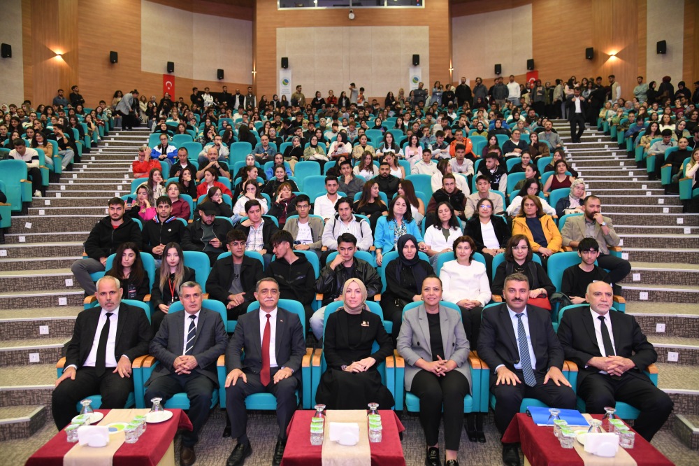 At the end of the session, Rector Prof. Dr. Mustafa Kasım Karahocagil and Provincial Youth and Sports Director Yasin Çakmakçı presented a gift to Deputy Minister of Youth and Sports Assoc. Prof. Dr. Safa Koçoğlu. The event concluded after a group photo was taken with the students.