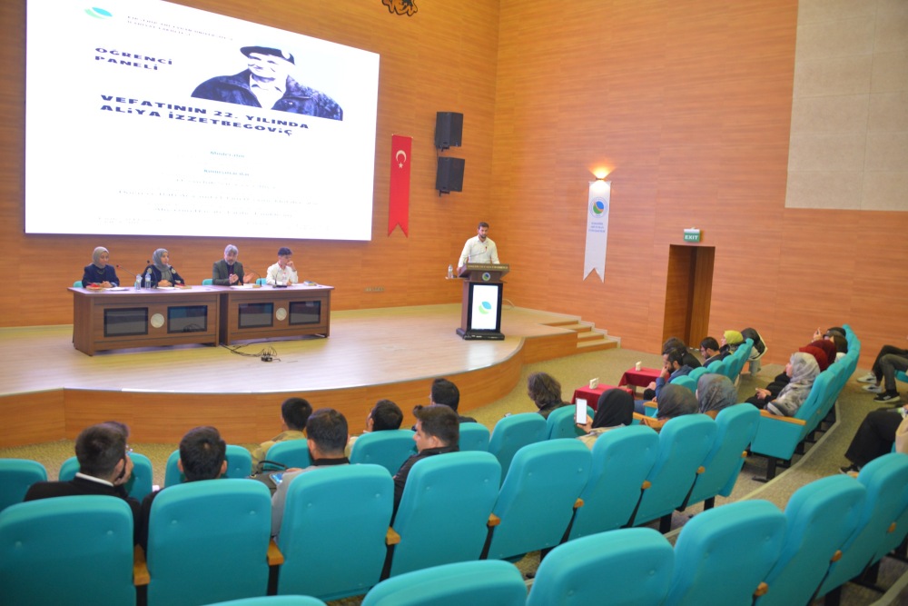 The Faculty of Theology organized a panel on October 20, 2025, at the Neşet Ertaş Hall of the Ahi Evran Congress and Culture Center to commemorate the 22nd anniversary of the death of Aliya Izetbegović. The student panel titled “Aliya Izetbegović on the 22nd Anniversary of His Passing” was attended by the Dean of the Faculty of Theology, Prof. Dr. Mehmet Murat Karakaya, academic and administrative staff, and students. The panel was moderated by Dr. İzzet Gülaçar, and the speakers were theology students Berfin Yıl, Gülcihan Güneş, and Burak Erçoban.