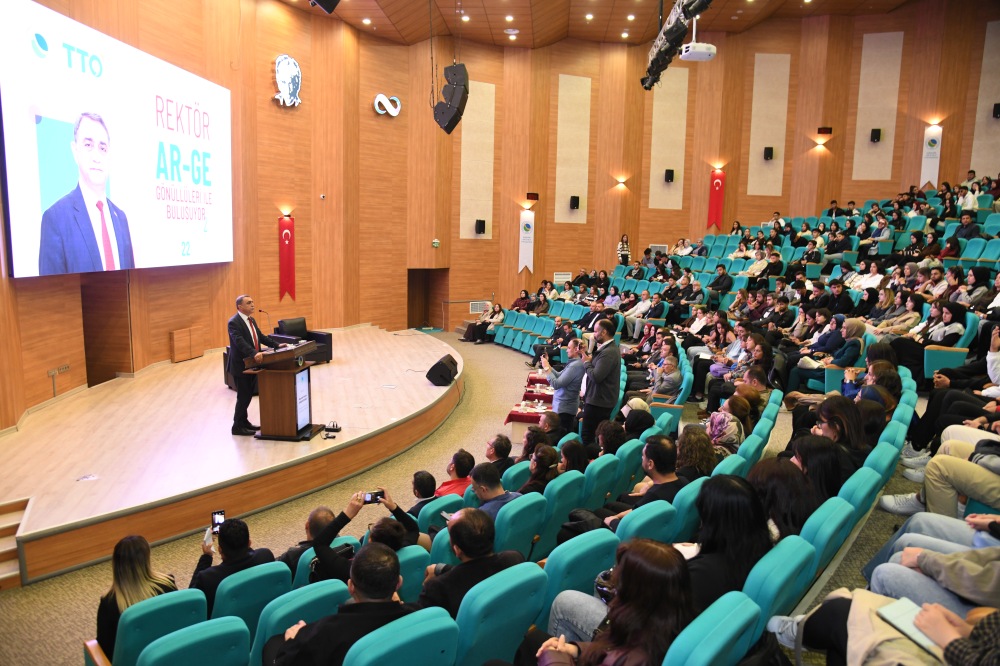 The event “Rector Prof. Dr. Mustafa Kasım Karahocagil Meets with R&D Volunteers,” organized by the Technology Transfer Office Application and Research Center (TTO), took place with a high level of participation. Held on October 22, 2025, at the 15 July National Will Hall of the Ahi Evran Congress and Culture Center, the program was attended by Rector Prof. Dr. Mustafa Kasım Karahocagil, Vice Rector and R&D Director Prof. Dr. Ali Güneş, Prof. Dr. Musa Özata, deans, directors, academic and administrative staff, and students.