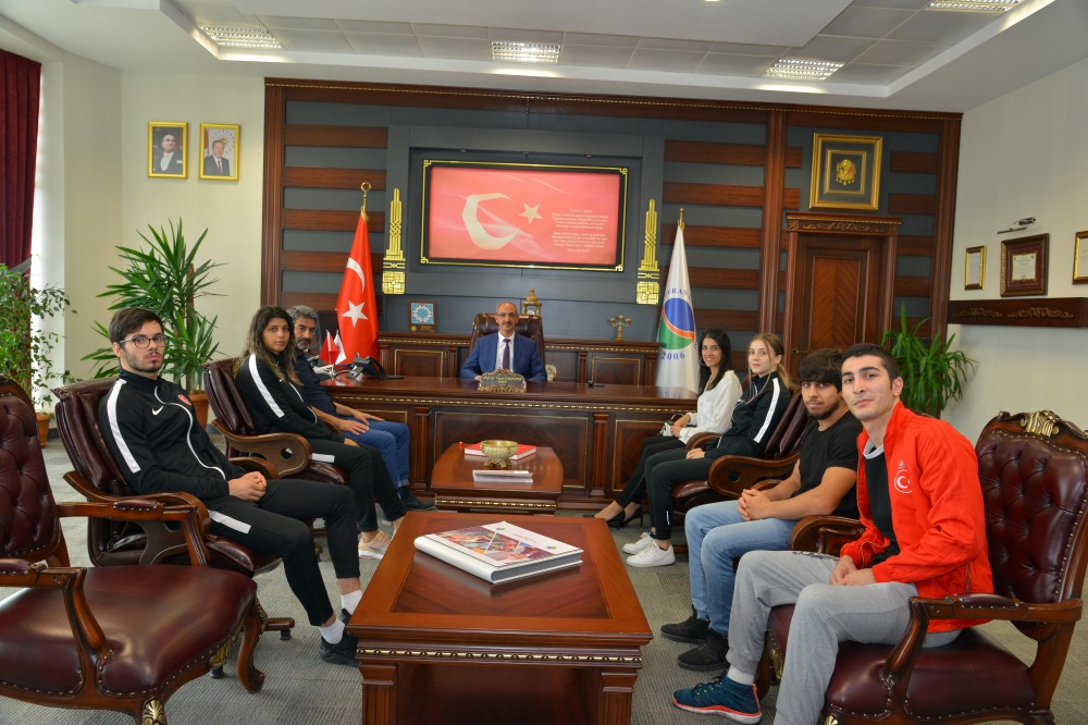 Dünya ve Avrupa Şampiyonu sporcuları 9 Ekim 2019 tarihinde Üniversitemiz Rektörü Prof. Dr. Vatan Karakaya makamında kabul ederek üniversitemizi tercih etmelerinden dolayı teşekkür etti. Kırşehir Ahi Evran Üniversitesi Beden Eğitimi ve Spor Yüksekokulunun Türkiye’nin en çok tercih edilen ve en başarılı yüksekokullarından biri olduğunu anlatan Rektör Karakaya, sporculara üniversitemize güç katacaklarını söyledi.