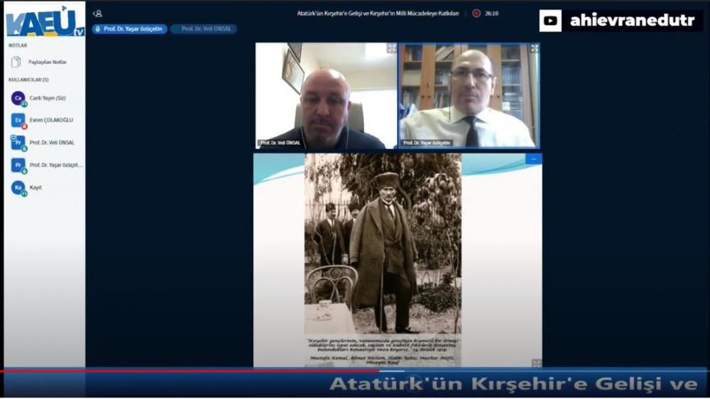 Atatürk’ün Kırşehir’e gelmesinin 101. yıldönümü münasebetiyle Üniversitemiz Fen Edebiyat Fakültesi Tarih Bölümü tarafından bir konferans düzenlendi. 24 Aralık 2020 tarihinde YouTube Kanalımızdan canlı yayınlanan konferans, Tarih Bölümü Başkanı Prof. Dr. Veli Ünsal ile Türkiye Cumhuriyeti Tarihi Anabilim Dalı Başkanı Prof. Dr. Yaşar Özüçetin tarafından verildi.