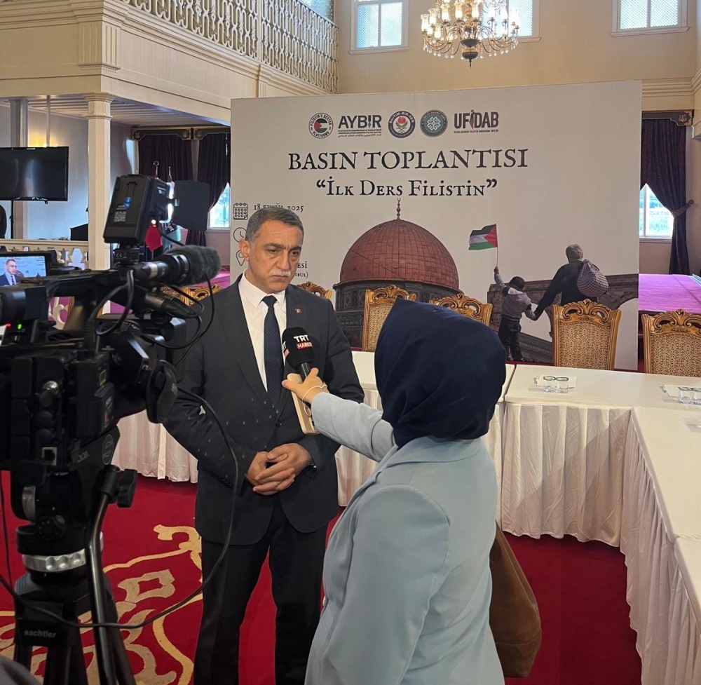 Toplantı sonrasında TRT Haber’e röportaj veren Üniversitemiz Rektörü Prof. Dr. Mustafa Kasım Karahocagil, 2025-2026 akademik yılı başlarken AYBİR, Eğitim-Bir-Sen, Türkiye Maarif Vakfı, UFİDAB ve Filistin’e Destek Platformu ile birlikte “İlk Ders Filistin” başlıklı basın toplantısına katıldıklarını belirterek konuşmasına şöyle devam etti: “Filistinli kardeşlerimizin sesi kampüslerimizden yükselmeli; Üniversitelerimiz Gazze’deki zulme karşı dayanışmayı güçlendirmelidir. Akademik iş birlikleri adaletin ve vicdanın yanında olmalı, Filistinli öğrenci ve akademisyenler için yeni destek programları hayata geçirilmelidir. Rabbim bu dayanışmayı bereketlendirsin.”