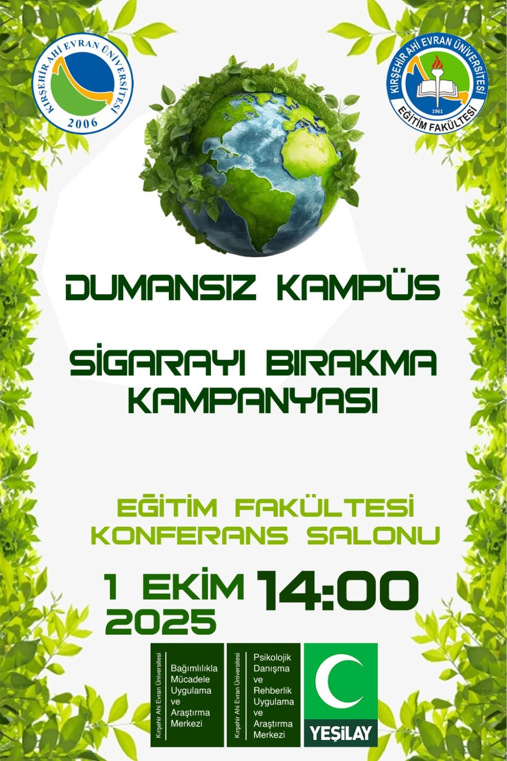 Sigara Bırakma Kampanyası kapsamında Kırşehir Ahi Evran Üniversitesi Bağımlılıkla Mücadele Uygulama ve Araştırma Merkez Müdürlüğü ve Kırşehir Ahi Evran Üniversitesi Psikolojik Danışma ve Rehberlik Uygulama ve Araştırma Merkez Müdürlüğü, Kırşehir Ahi Evran Üniversitesi Eğitim Fakültesi Rehberlik ve Psikolojik Danışmanlık Anabilim Dalı ile Kırşehir İl Sağlık Müdürlüğü tarafından üniversitemiz Eğitim Fakültesi konferans salonunda öğrencilerimiz ve personelimize yönelik karbonmonoksit ölçümü ve sigara bırakma eğitimi gerçekleştirilecektir.