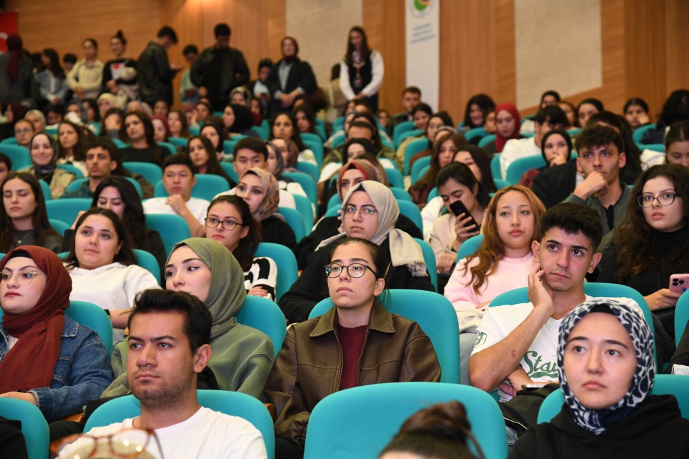 After Rector Prof. Dr. Mustafa Kasım Karahocagil’s speech, the session continued with a talk by Deputy Minister of Youth and Sports Assoc. Prof. Dr. Safa Koçoğlu. During her talk, Deputy Minister Koçoğlu discussed volunteer projects, sharing her experience in youth work and volunteer-driven activities over many years. She emphasized that personal development requires more than just academic success and pointed out the strong impact of social activities on student growth. Koçoğlu also shared insights about her own path to becoming Deputy Minister and encouraged young people, expressing confidence in their potential. “Those without ambition today cannot build tomorrow,” she said, offering valuable advice to the students throughout the session.
